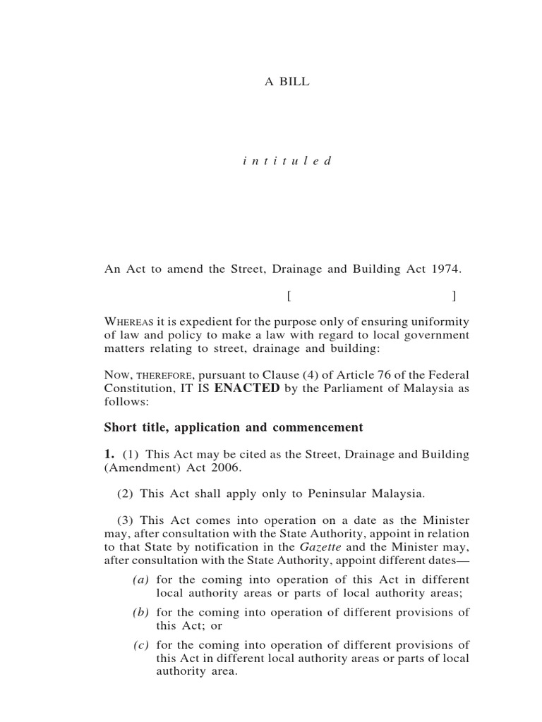 Street, drainage and building act, (act 133) malaysia (1974). Town and country planning act, (act 172) malaysia (1976). Indian legislation act 1848, municipal rates act 1848, street drainage and building act 1974, local government act 1976, town and country planning act 1976, federal treasury circular no.15google scholar. (2) this act shall apply only to west malaysia. (1) this act may be cited as the street, drainage and building act 1974.